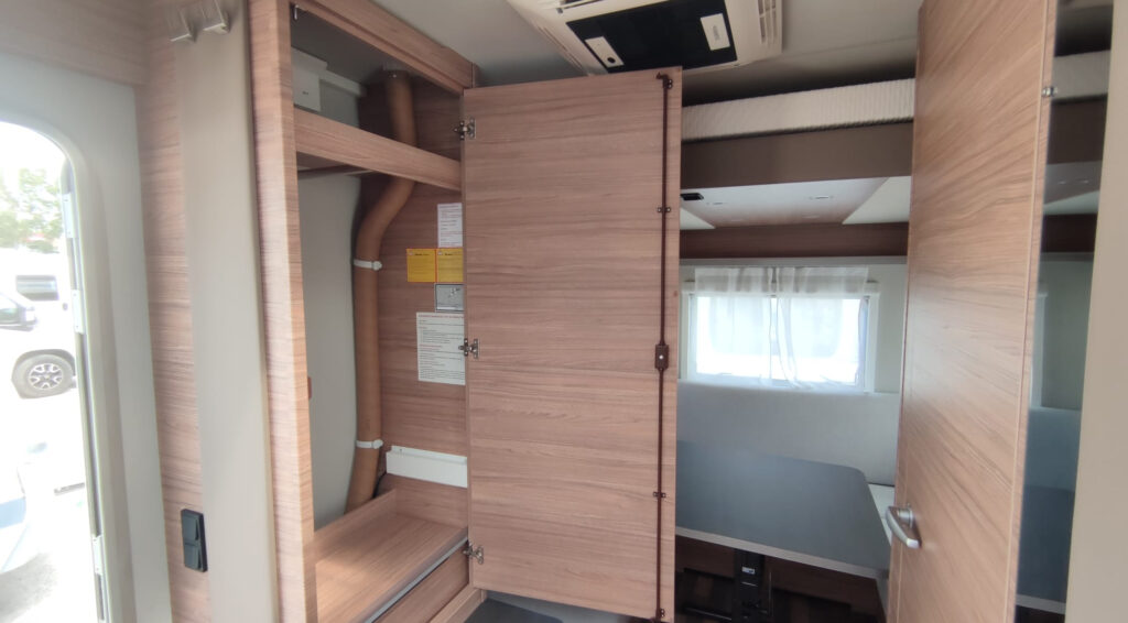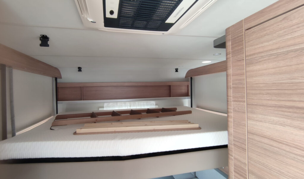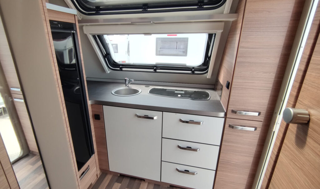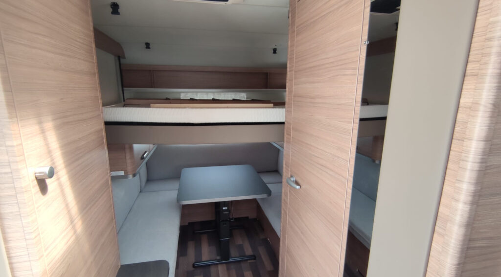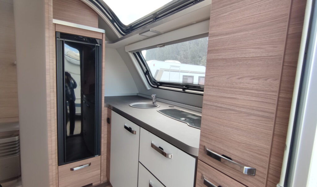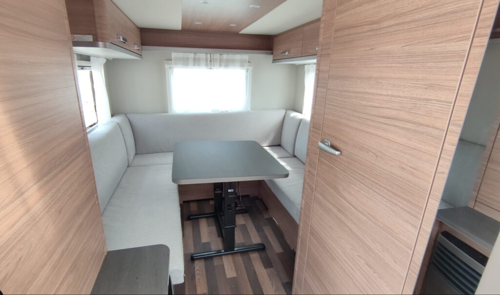 Caravana de ocasión con una distribución única: en la parte trasera dispone de un comedor rotonda muy grande, convertible en cama doble. Y en la parte superior hay una cama doble basculante, que sube y baja. En la zona delantera encontramos una gran cocina con frigorífico grande.