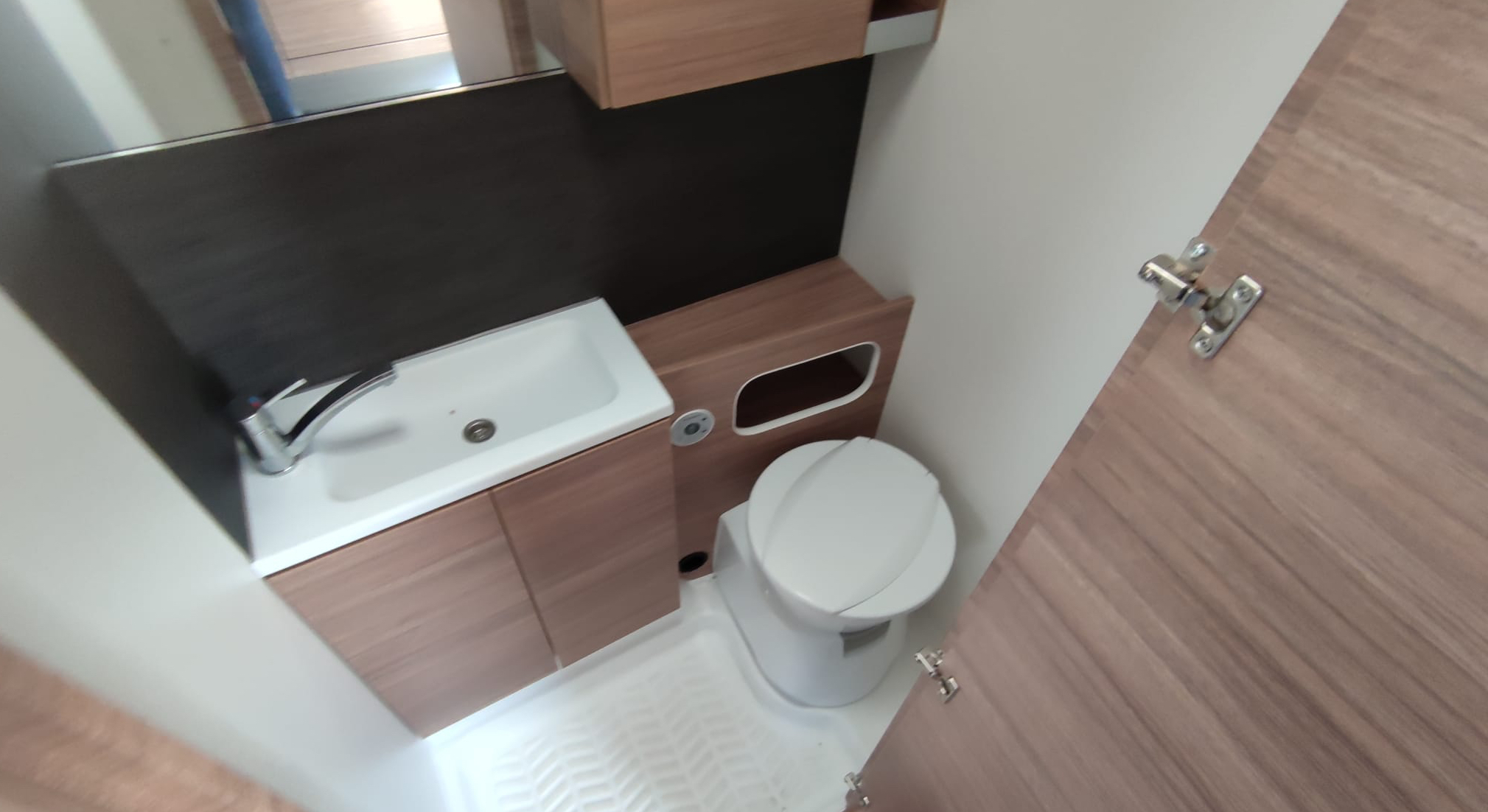 Caravana de ocasión con una distribución única: en la parte trasera dispone de un comedor rotonda muy grande, convertible en cama doble. Y en la parte superior hay una cama doble basculante, que sube y baja. En la zona delantera encontramos una gran cocina con frigorífico grande.