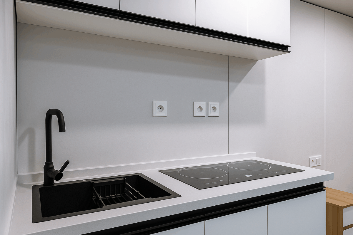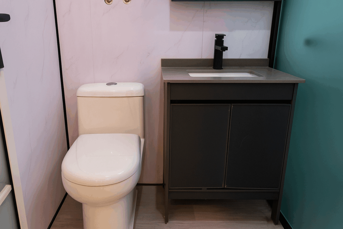 Cocina con encimera de cuarzo y baño con diseño de separación seco-húmedo
