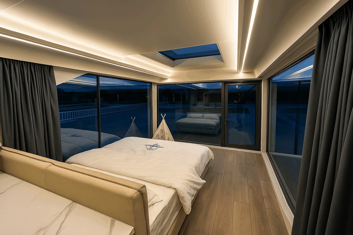 Salón comedor moderno, Dormitorio confortable, Baño de diseño elegante, Amplios ventanales panorámicos que llenan el espacio de luz natural. Su tamaño compacto y funcionalidad la convierten en la opción perfecta como vivienda principal, casa de invitados, alojamiento turístico o retiro privado.