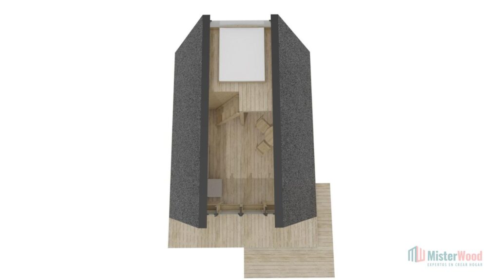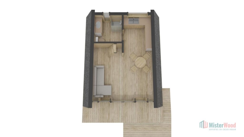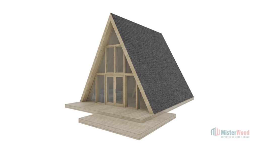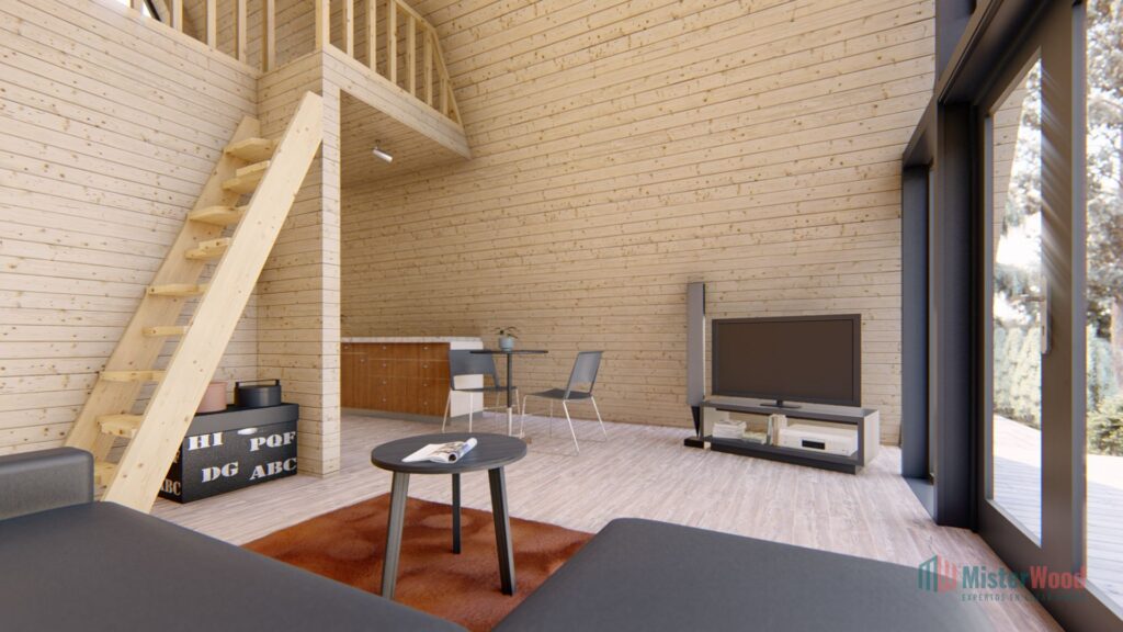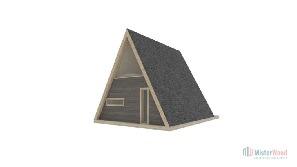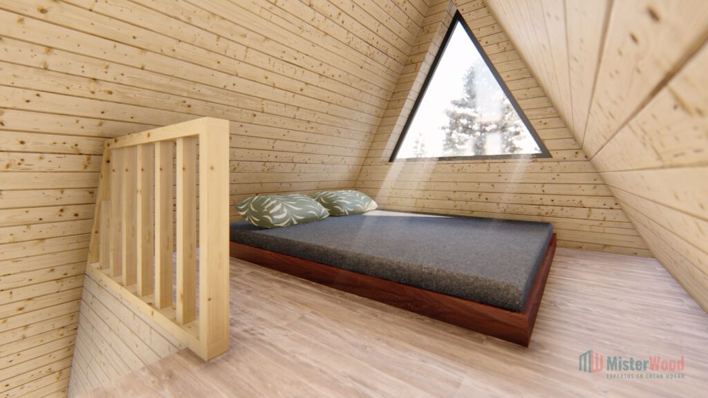 Nuestro modelo Águila es una casa de madera con un diseño alpino y techo a dos aguas. Con una superficie de 42m², con cocina- comedor, salón y baño en la planta baja y la habitación en la planta alta.