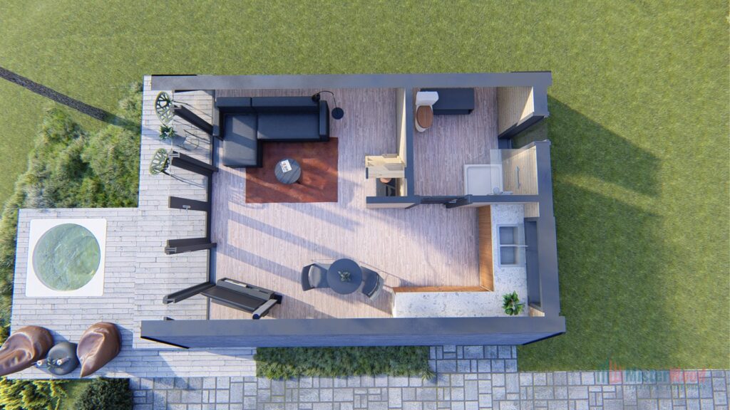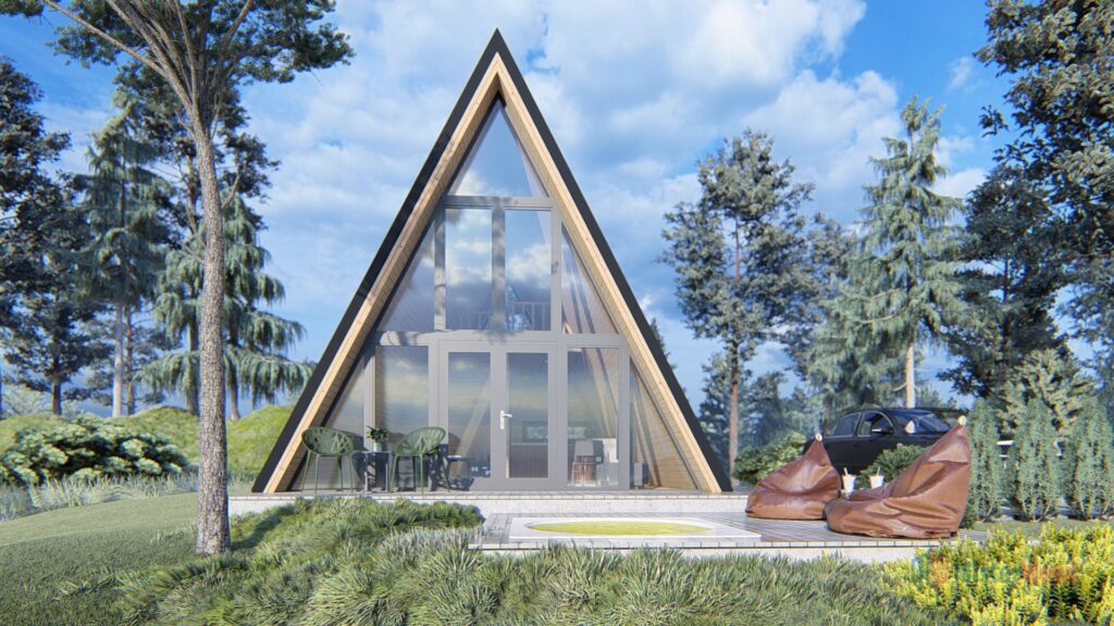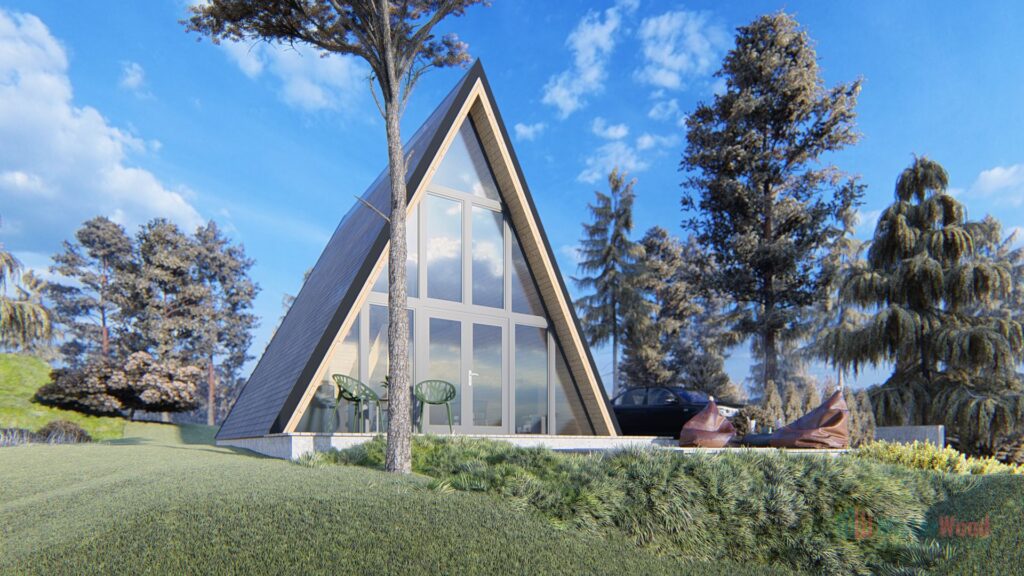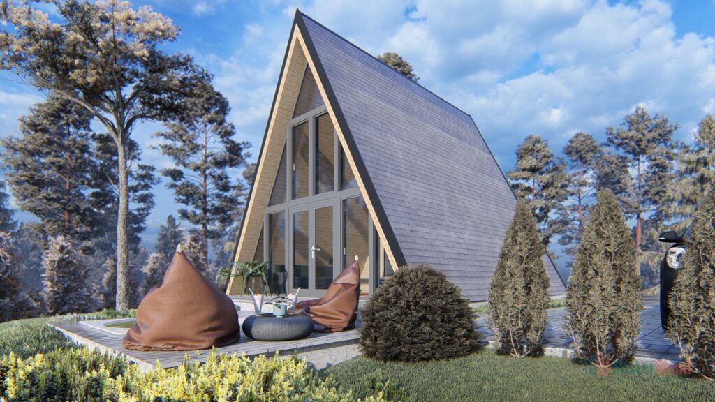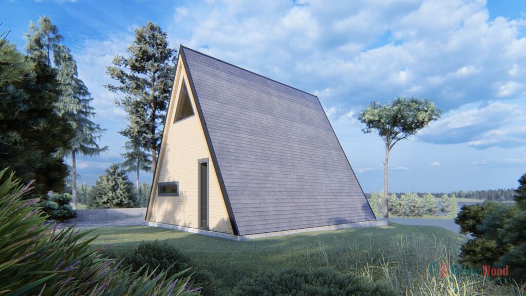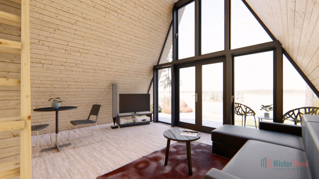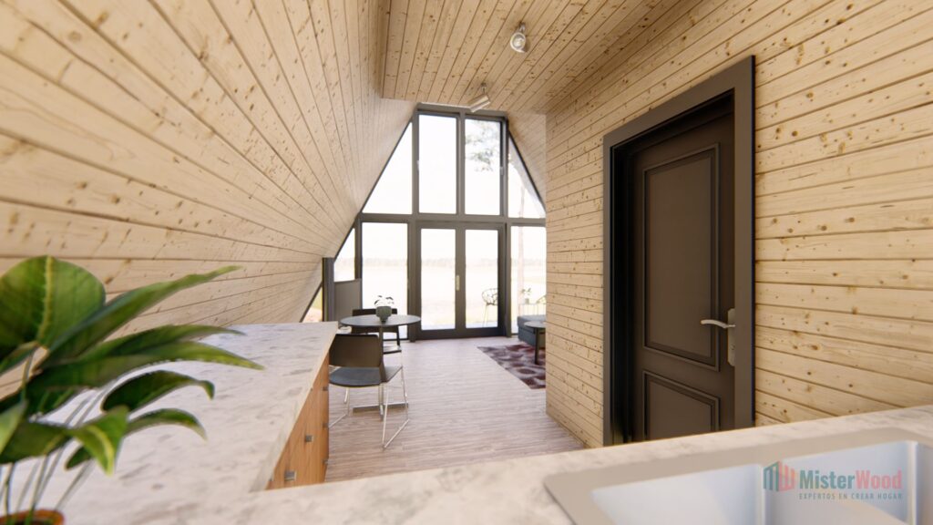 Nuestro modelo Águila es una casa de madera con un diseño alpino y techo a dos aguas. Con una superficie de 42m², con cocina- comedor, salón y baño en la planta baja y la habitación en la planta alta.