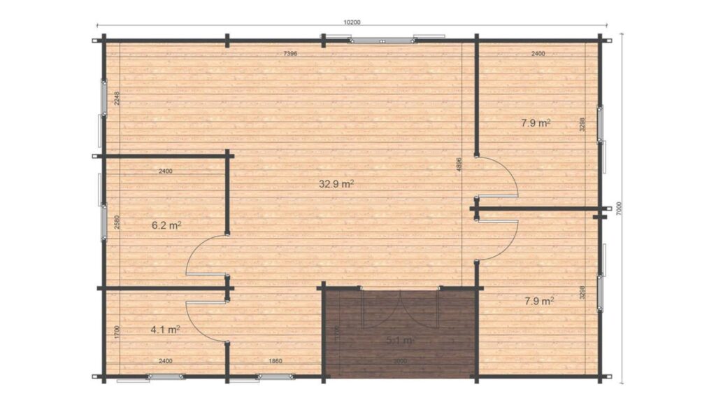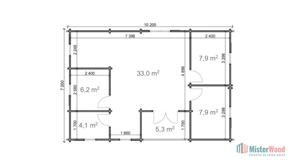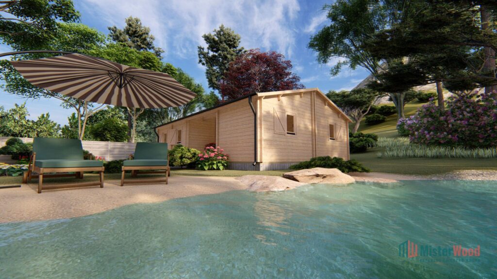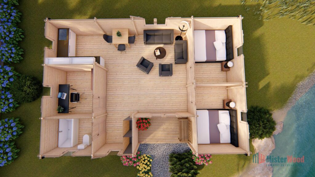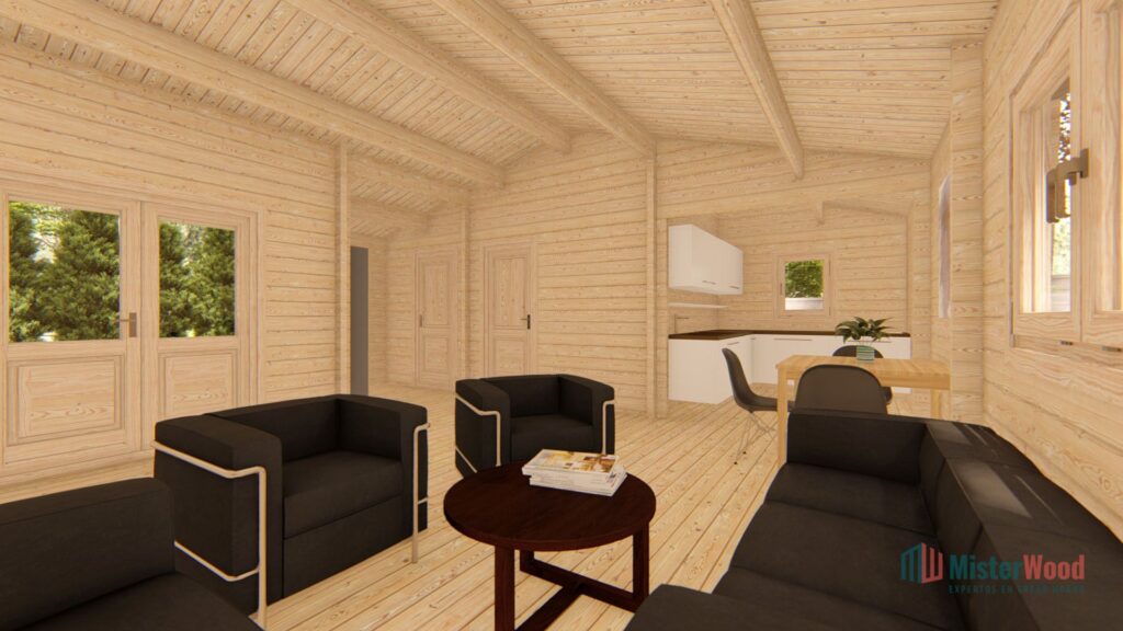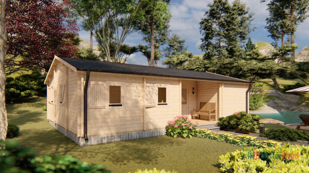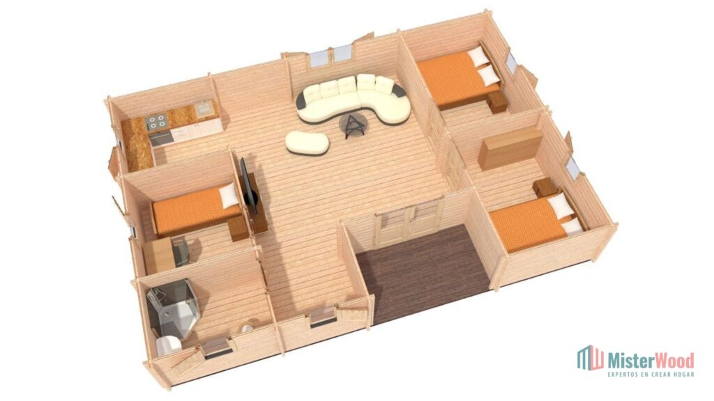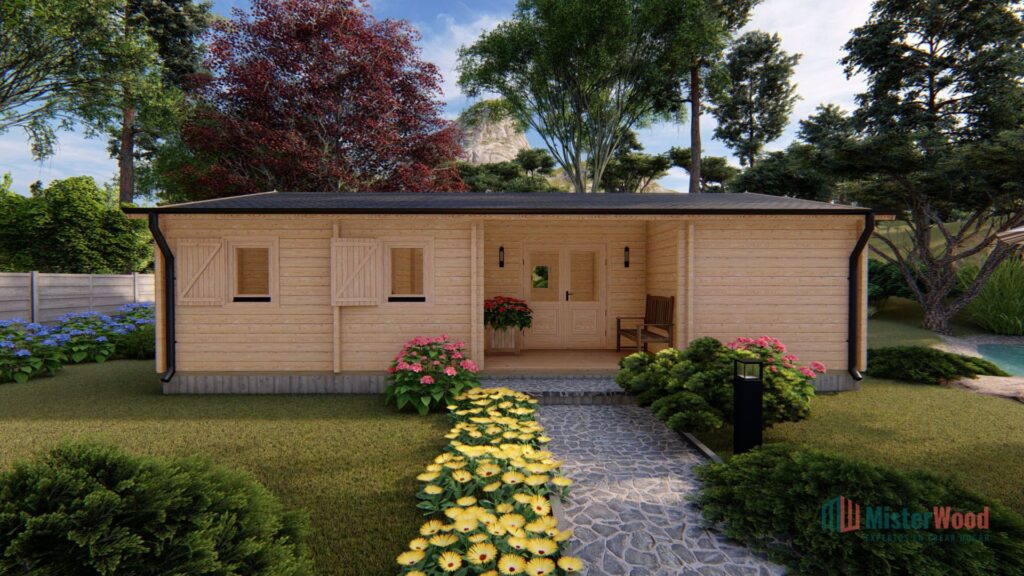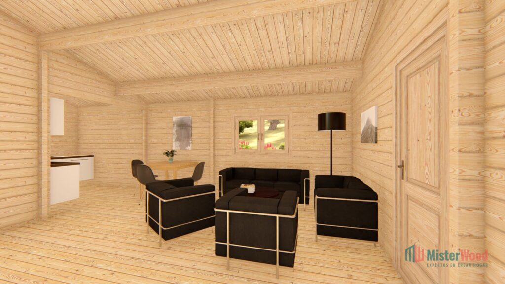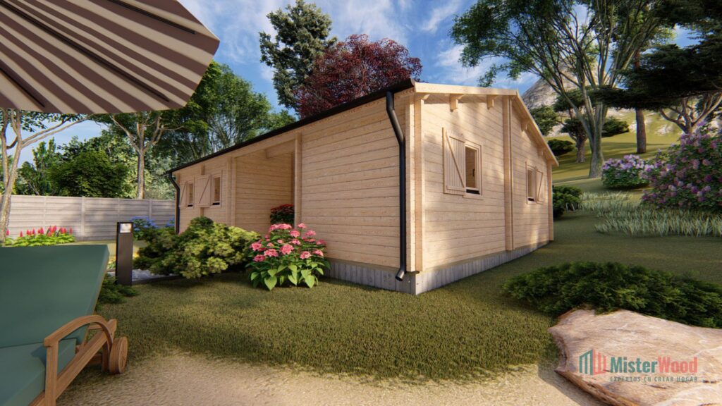 Nuestro modelo Elvira es una casa de madera con diseño rústico y techo a dos aguas.