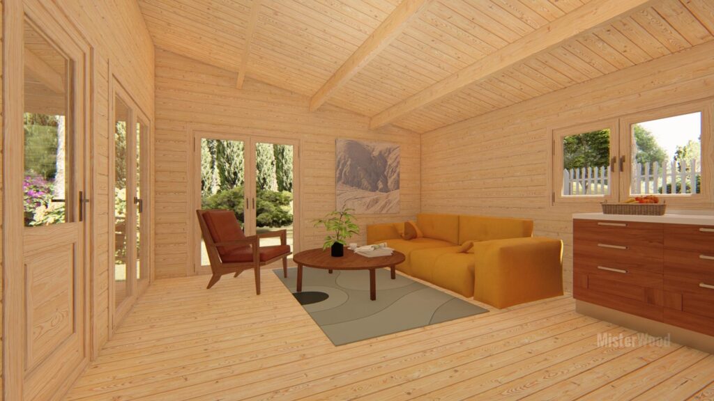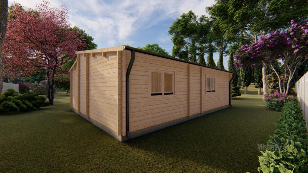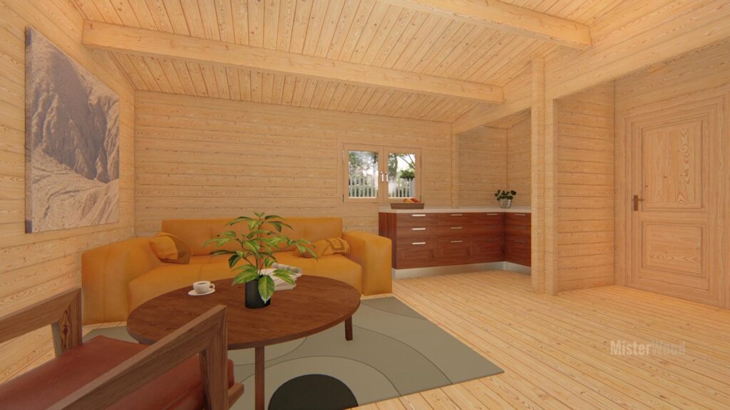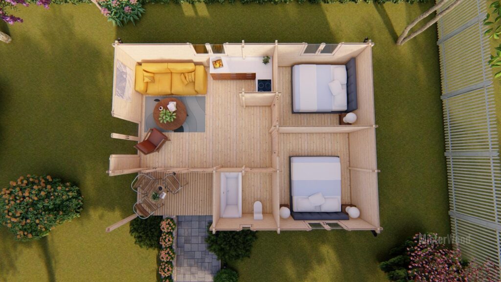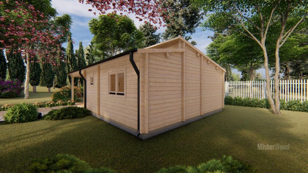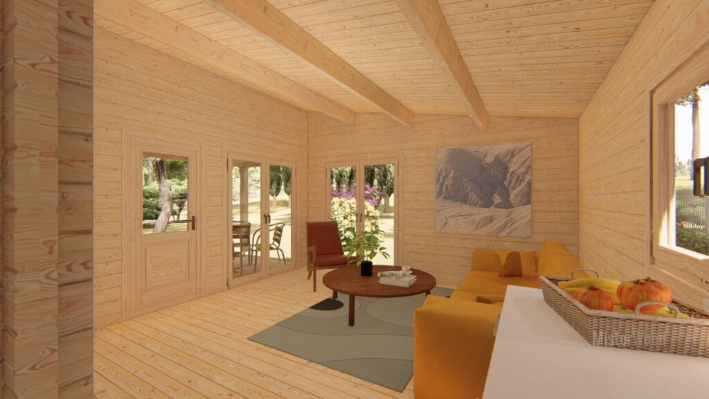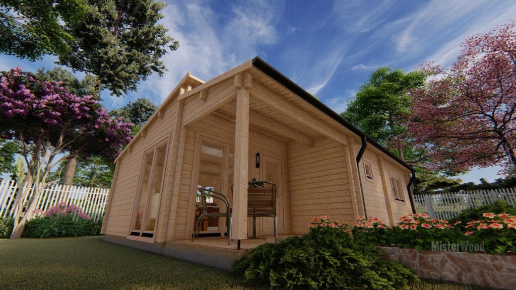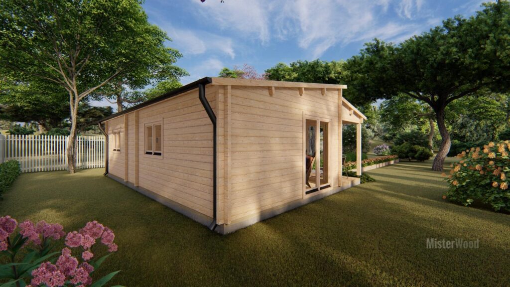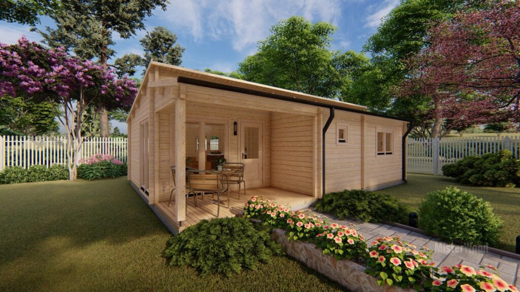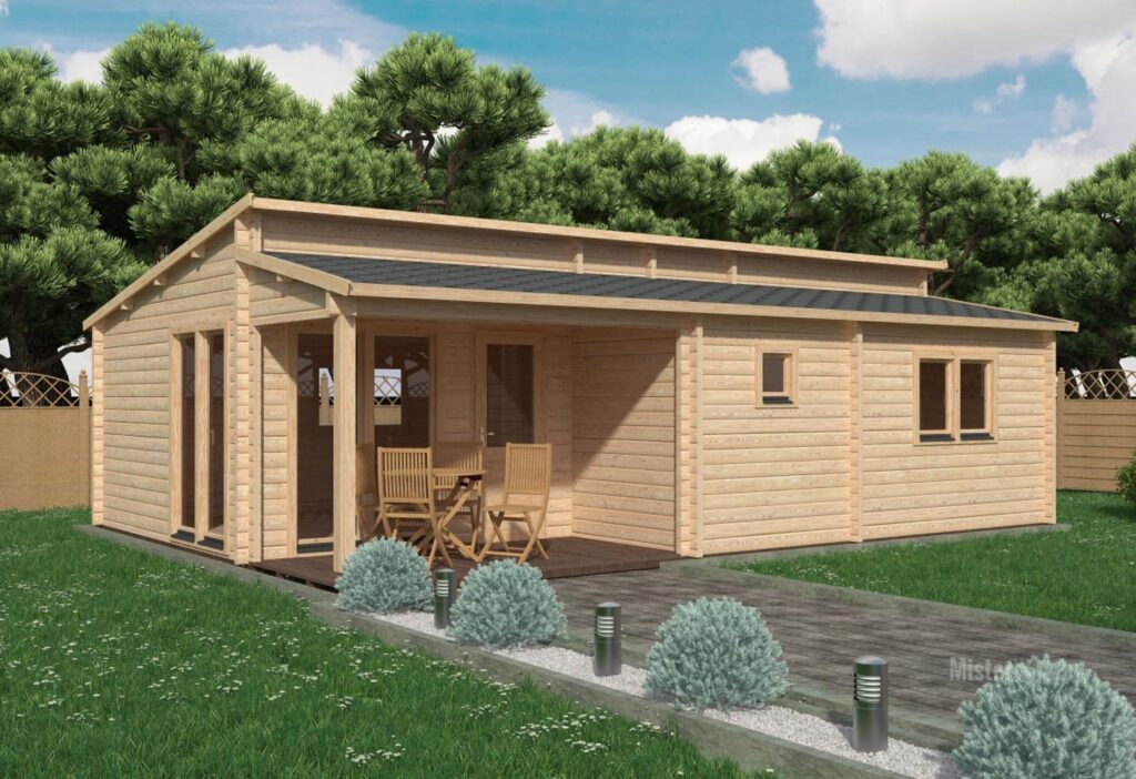 Esmeralda casa de madera con un diseño clásico rústico y techo a dos aguas. Con una superficie de 57m², en su interior encontrarás 2 habitaciones, 1 baño, cocina, salón comedor muy luminoso y una pequeña terraza techada.