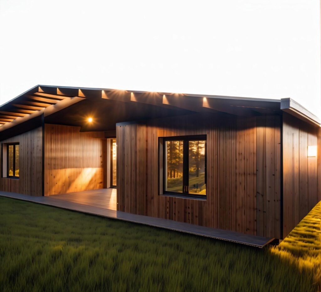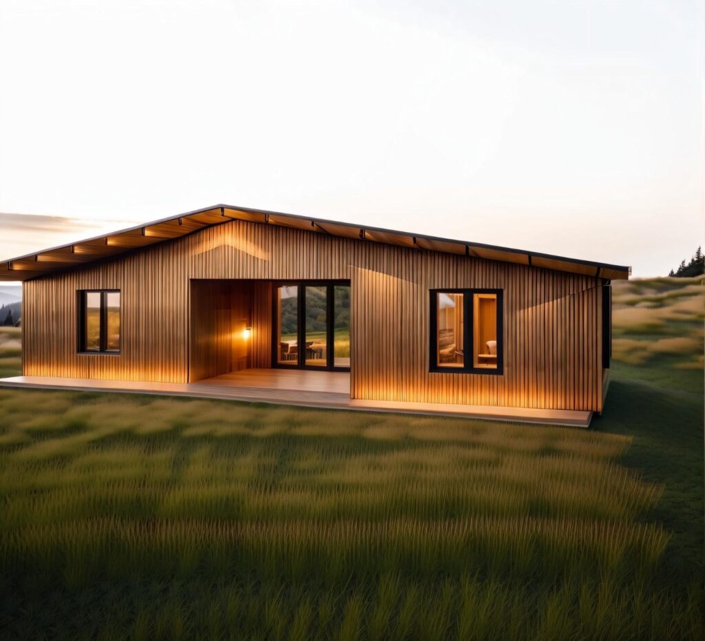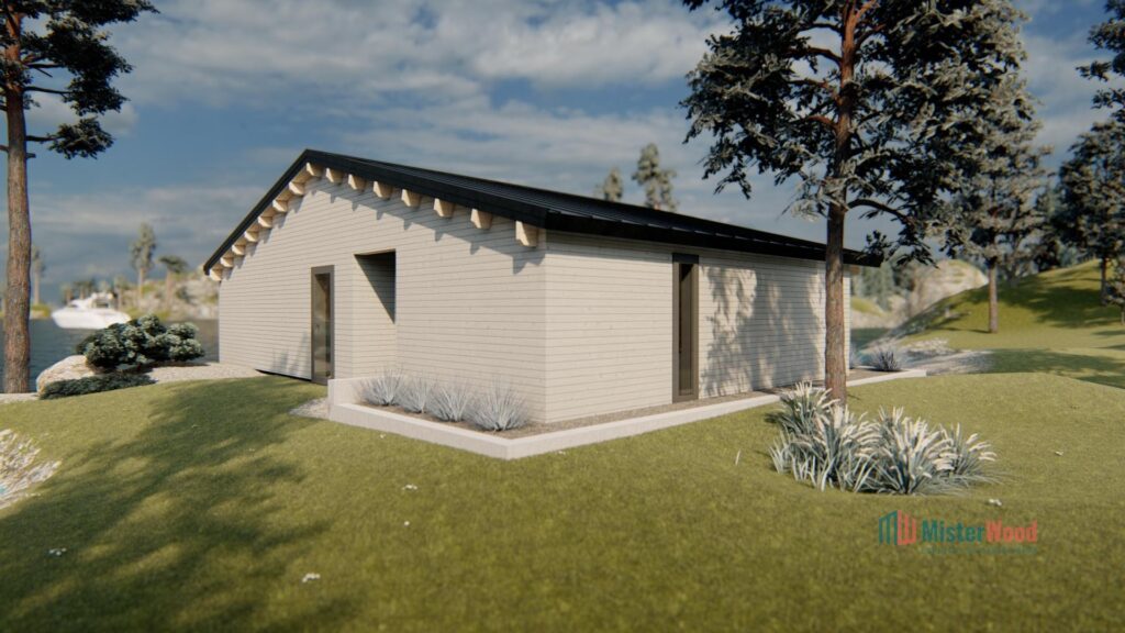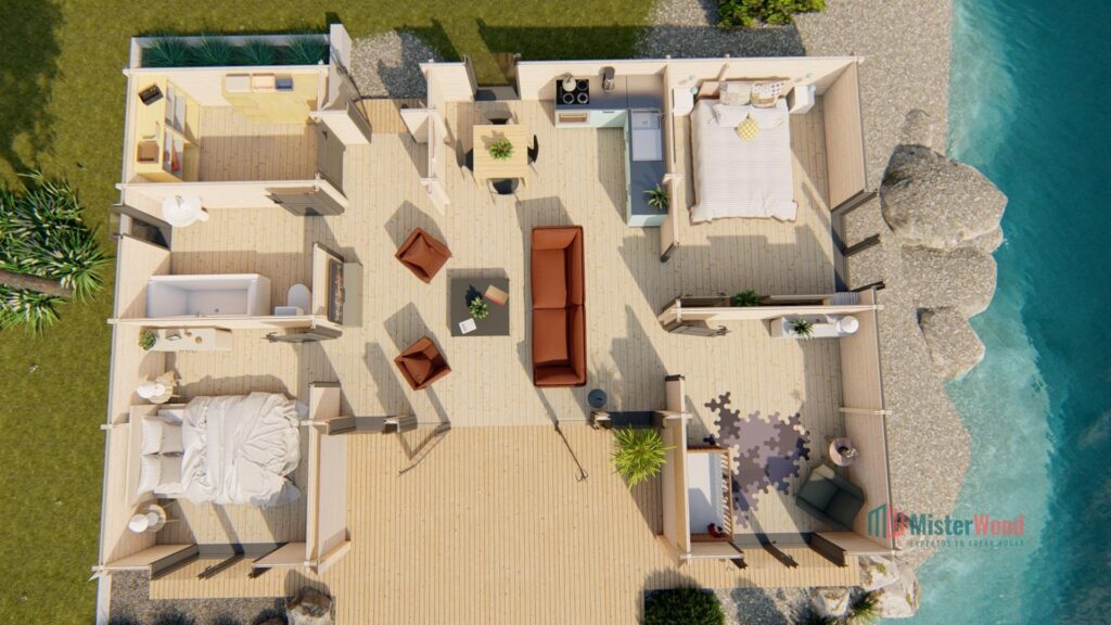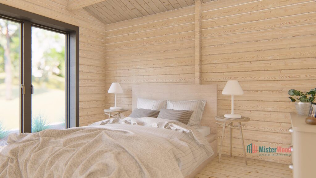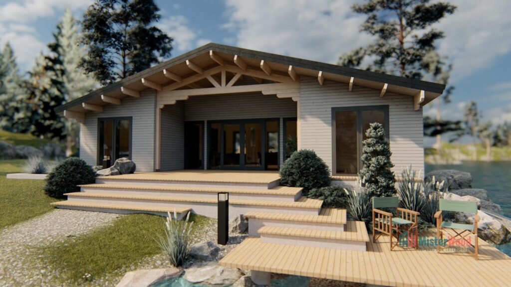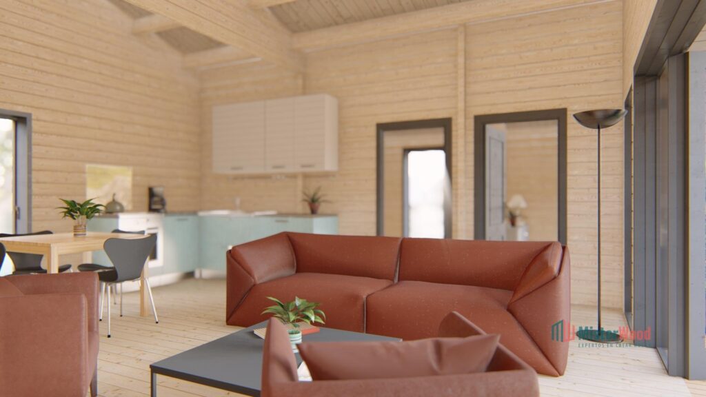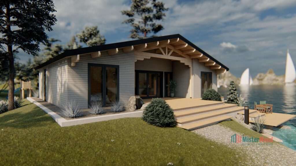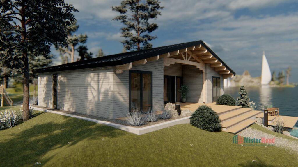 Presentamos a Julia casa de madera diseño elegante y techo a dos aguas. Con una superficie de 98m², su interior es super luminoso y cuenta con una de 3 habitaciones, vestidor (o 4º habitación), 1 baño, cocina – comedor, salón y terraza techada.