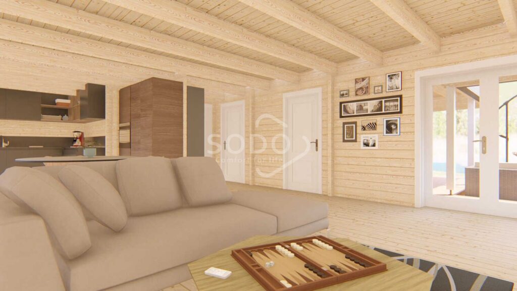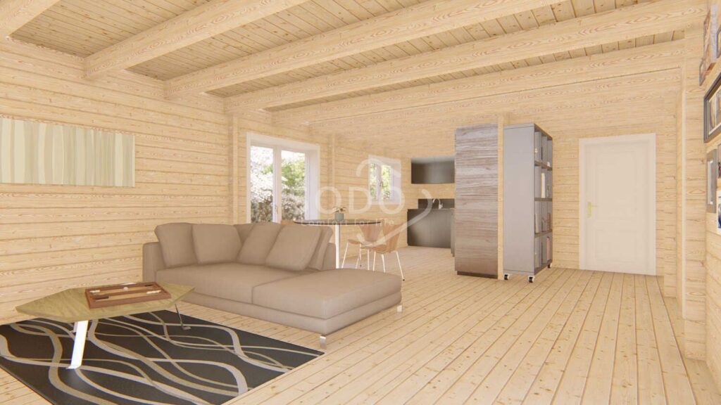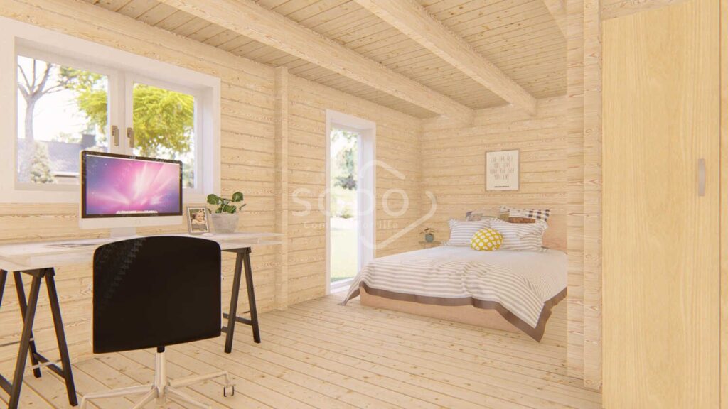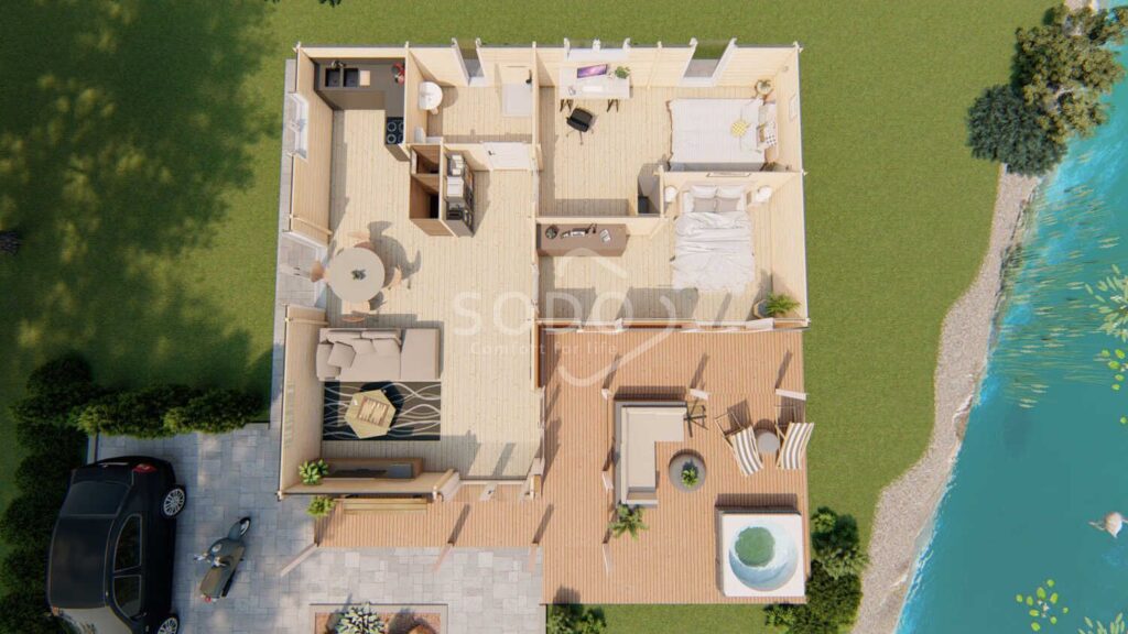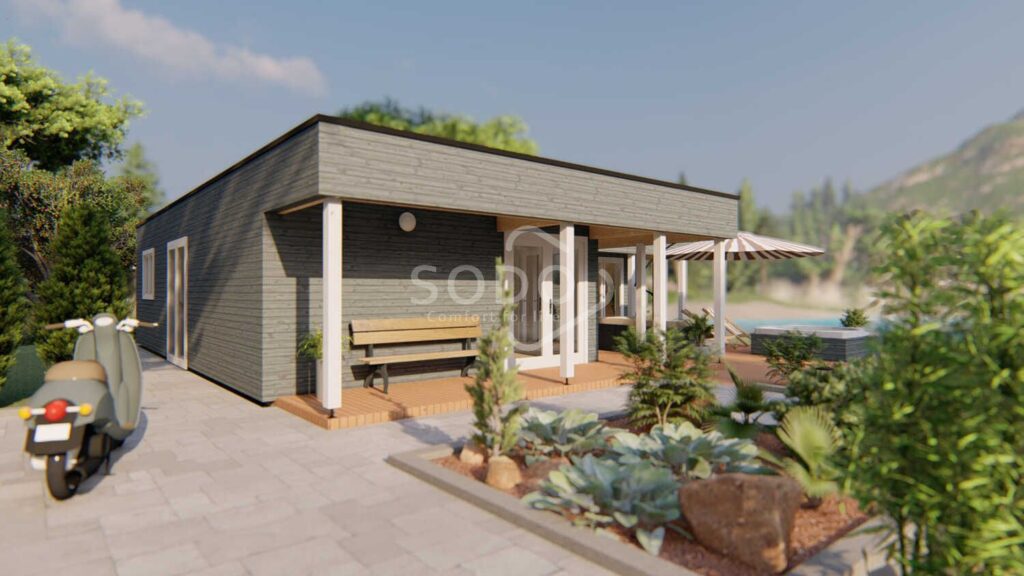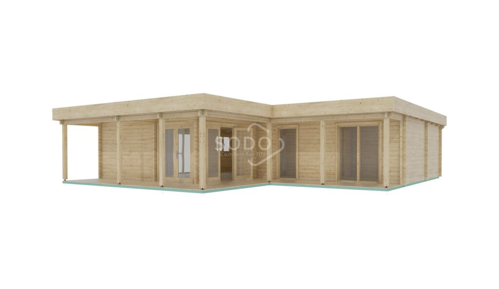 Esta elegante casa en forma de L cuenta con una terraza de 21 m2, grandes ventanas altas y una puerta completamente acristalada que conecta los espacios interiores y exteriores. Con 2 dormitorios, un baño, área de cocina y amplia sala de estar, ofrece un espacio de vida cómodo y moderno.