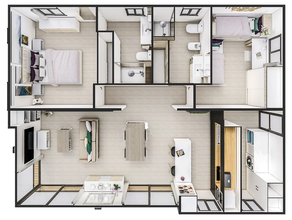 El modelo Alabama se caracteriza por la gran amplitud de sus espacios y la luminosidad que aporta a su interior debido a sus extensos ventanales. Este nuevo modelo destaca al mismo tiempo por la adición de la galería junto a la cocina, lo que le da ese toque más doméstico.