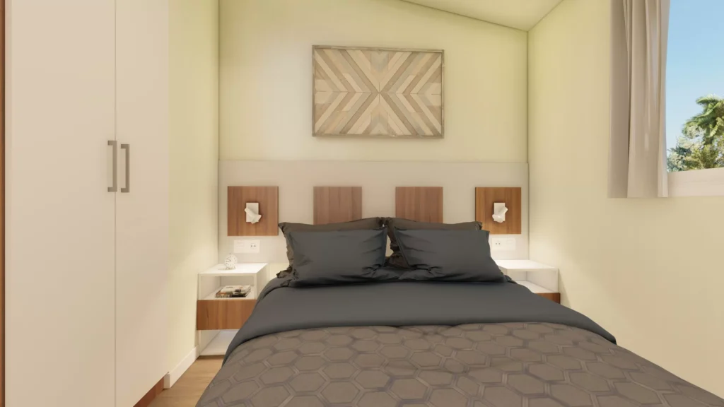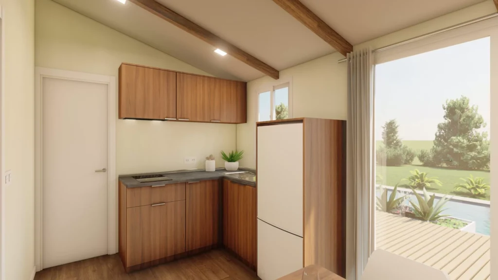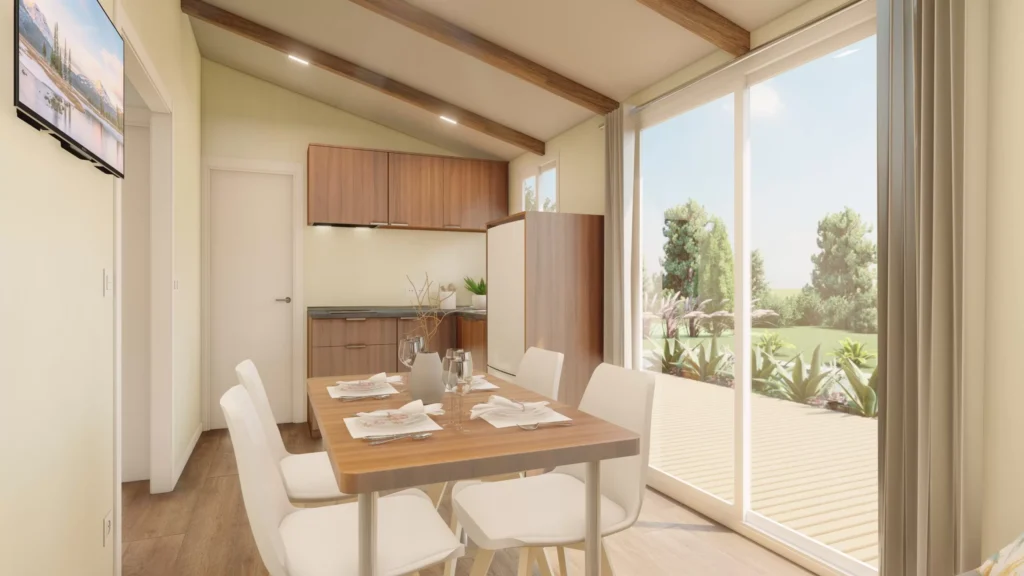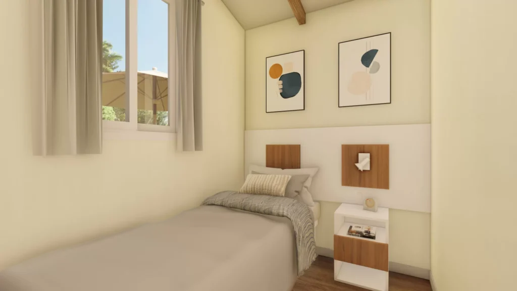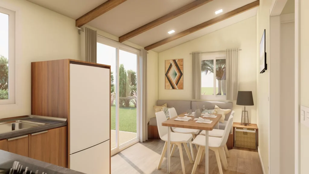 Bungalow formado por dos piezas de 2,50m de ancho tipo Twin. Este modelo tiene un ancho especial para su fácil transporte y acceso a las parcelas. Cuenta con una zona de salón-cocina de grandes dimensiones. Su distribución, permite dividir la zona de estar de la zona de dormitorios.