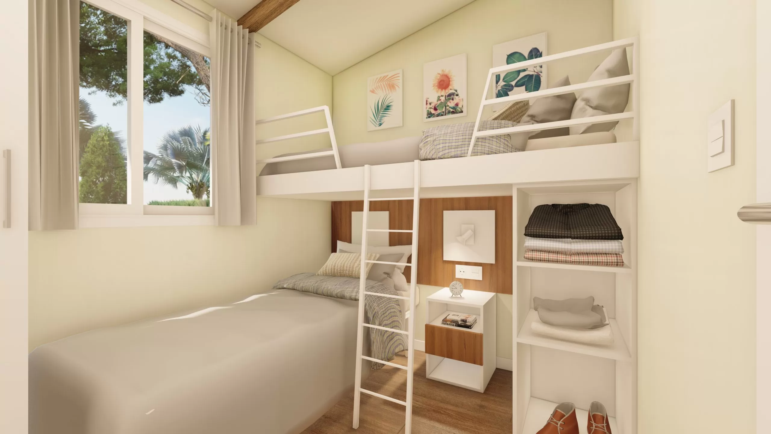 Bungalow formado por dos piezas de 2,50m de ancho tipo Twin. Este modelo tiene un ancho especial para su fácil transporte y acceso a las parcelas. Cuenta con una zona de salón-cocina de grandes dimensiones. Su distribución, permite dividir la zona de estar de la zona de dormitorios.
