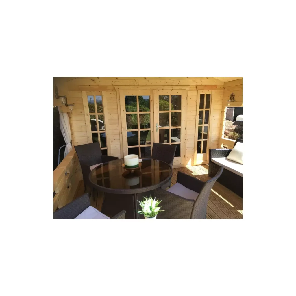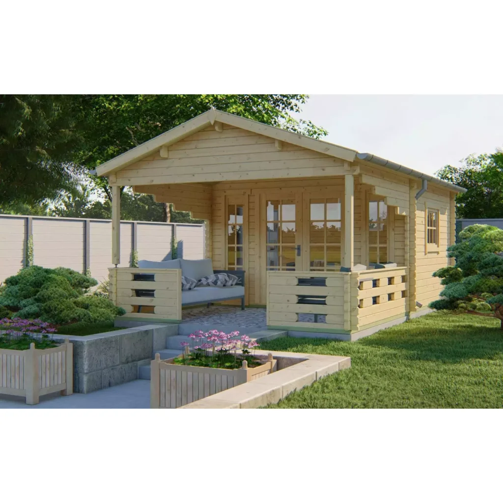 Está fabricada con lamas de madera machihembradas de 44 mm de grosor, que hacen de la casa una construcción muy robusta, con todo el confort y aislamiento que este grosor de madera maciza aporta.