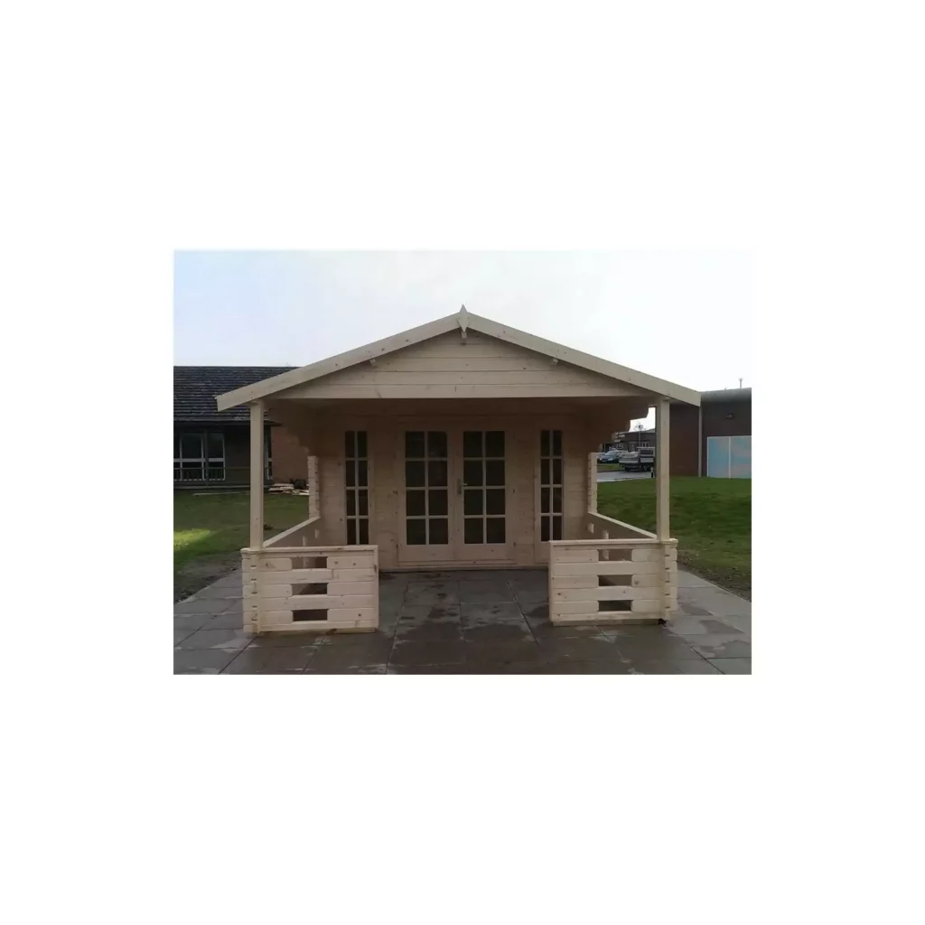 Casas de madera Andújar con porche. Esta casa de madera tiene un diseño muy especial ya que tiene una superficie de 10.8 m2 y un porche adosado frontal con barandilla de madera de 9 m2 adicionales.