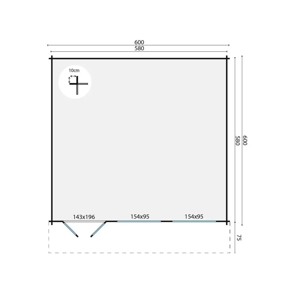 Las medidas interiores son de 580×580 cm y las exteriores de 600×600+75 cm. Las tablas del tejado van machihembradas para conseguir una alta durabilidad.