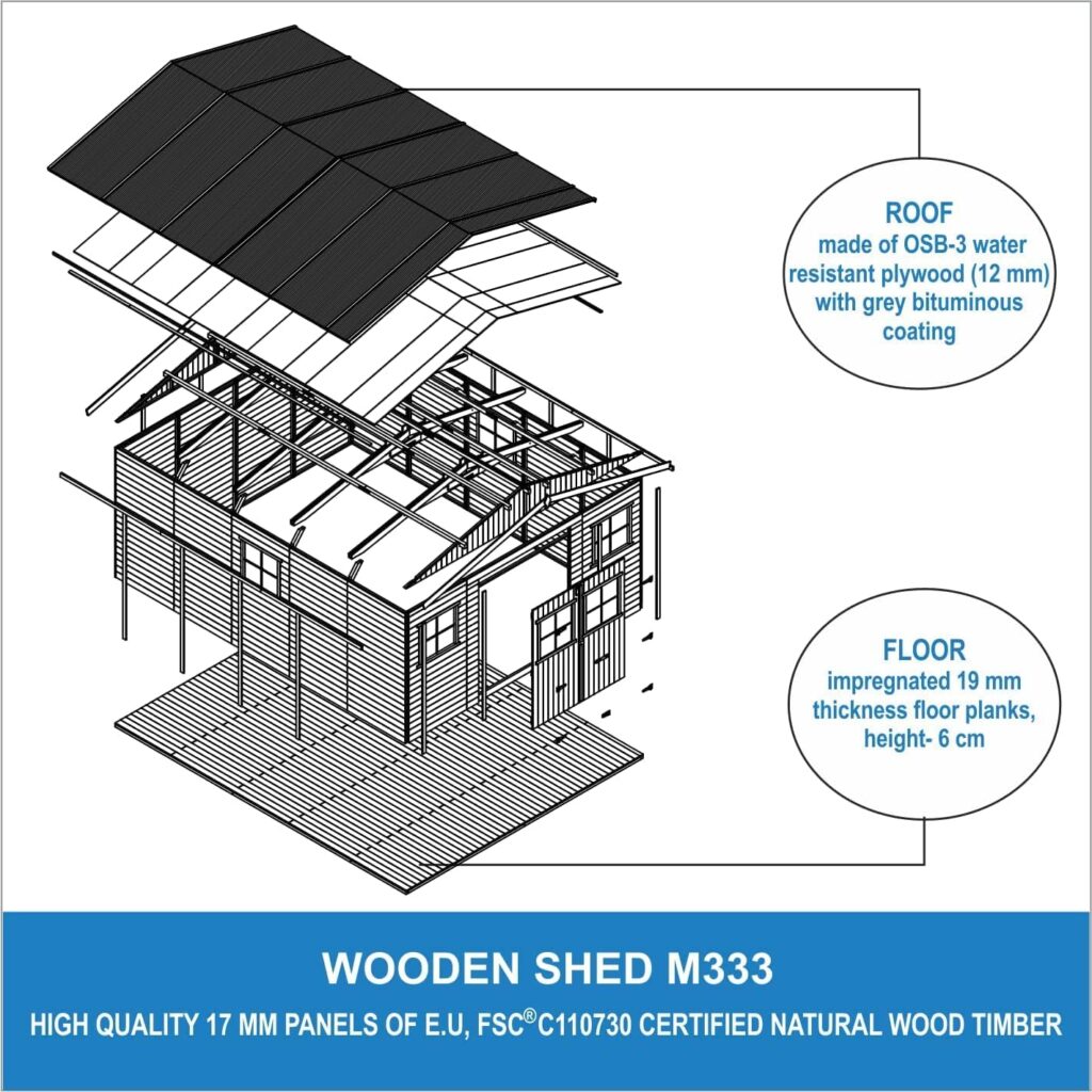 ROBUSTOS PANELES DE REVESTIMIENTO. Revestimiento de madera de abeto y pino de alta calidad traslapado con paneles de 17mm de espesor. Este cobertizo está diseñado para durar y viene con una garantía de fabricante de 2 años. Con el cuidado y mantenimiento adecuados, ofrecerá una vida de uso. (*Debido a las propiedades naturales de la madera, el tamaño puede variar de 1 a 2 mm.)