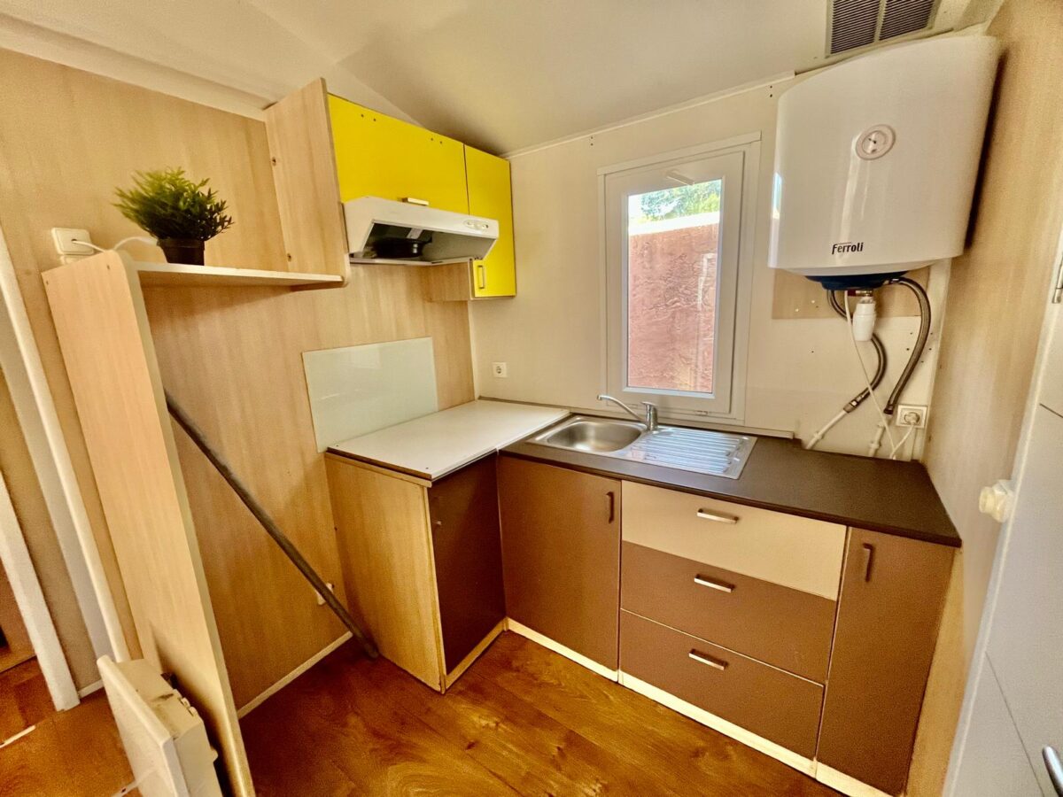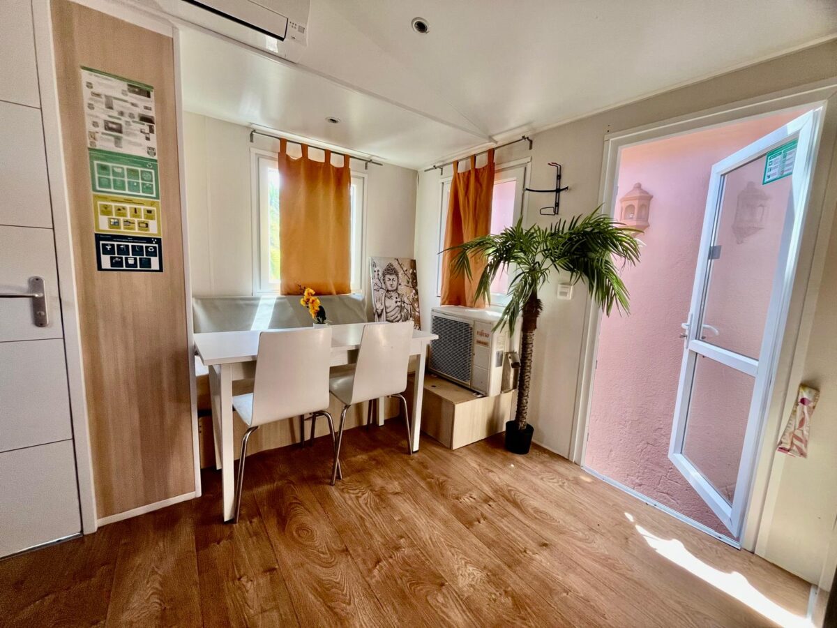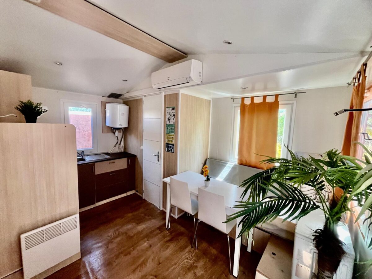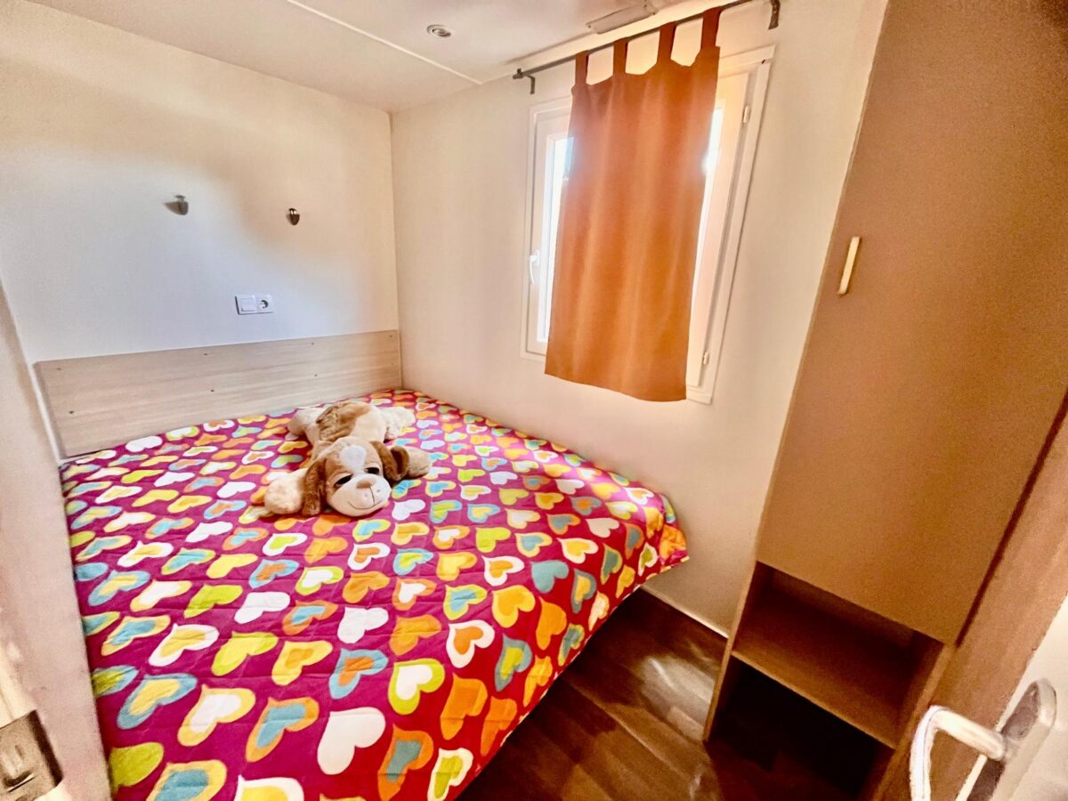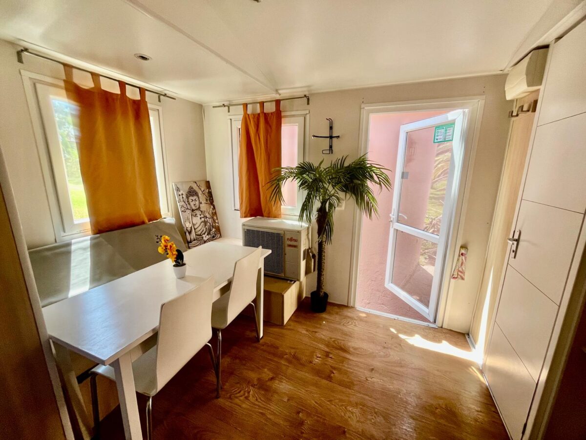 Se trata de una estupenda casa de 5,5m x 4m. con 2 dormitorios, esta en buen estado. Se vende totalmente amueblada y equipada, con camas, armarios, sofás, mesa de salon, termo de gas, cocina amueblada y equipada, con frigorífico, 4 fiegos para cocinar de gas, baño con plato ducha y otro baño con wc, también incluye aire acondicionado.
