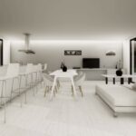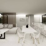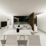 La cocina se integra en el salón y abre, igual que el salón, hacia la terraza y la piscina.