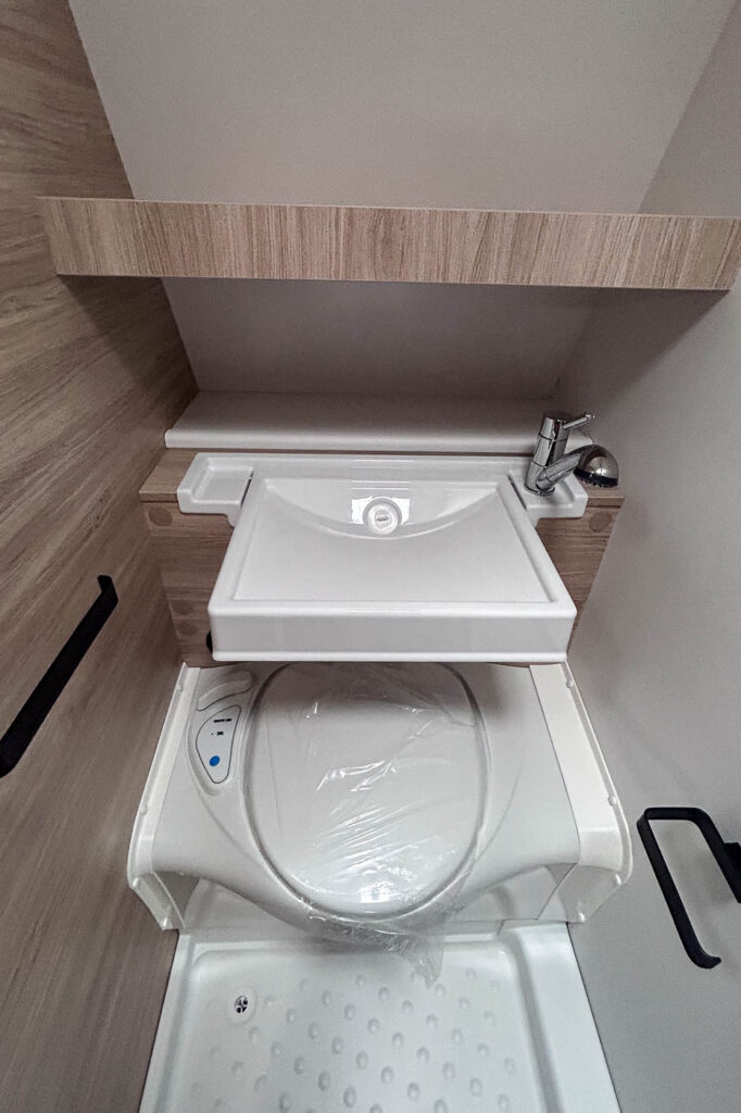 Dispone de baño compacto con W.C., lavamanos plegable, ducha extensible y placa ducha en el suelo.